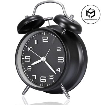 This classic 4-inch twin bell alarm clock is designed to be extra loud, ensuring even heavy sleepers wake up without a snooze option. Crafted with a high-quality metal frame and a matte black finish, it boasts a modern aesthetic that is robust enough for daily handling. The clock also includes a soft backlight for easy time-telling in the dark, activated by a simple button press. Its super silent sweep second hand ensures a tick-tock-free environment, promoting peaceful sleep and work. Powered by a single AA battery, this clock offers precise timekeeping with low power consumption, measuring 6.5 inches tall, 4.1 inches wide, and 2.2 inches deep.