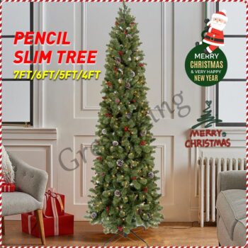 Bring the holiday spirit into your home with this premium tall artificial Christmas tree. Its slim pencil design makes it a fantastic choice for any space, looking great as soon as it’s set up and maintaining its appearance for years to come. Available in 5, 6, and 7-foot sizes, this tree is designed for convenience with an easy construction featuring hinged branches that quickly assemble and disassemble for effortless setup and storage. The tree is supported by a sturdy, foldable iron base that provides excellent balance and support. To protect your flooring, the stand is equipped with a scratch-resistant soft leather case on its ends. This durable metal base ensures your tree will stand tall and beautiful throughout the holiday season and for many years to follow.